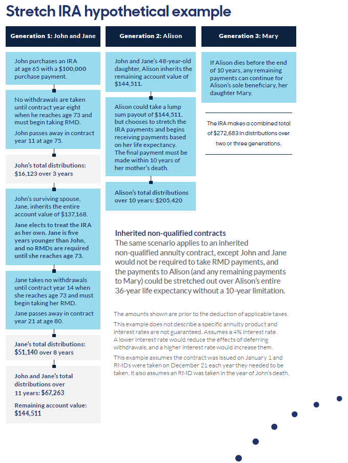 You've worked hard to secure your financial future and may have additional assets you want to leave for your loved ones. Taking only the Required Minimum Distribution (RMD) from your IRA, or allowing your non-qualified annuity to continue to grow tax-deferred, could help minimize your own taxes and leave funds for your beneficiaries. However, when these assets pass to your beneficiaries, taking a distribution as a lump sum can cause significant tax burdens for your loved ones.