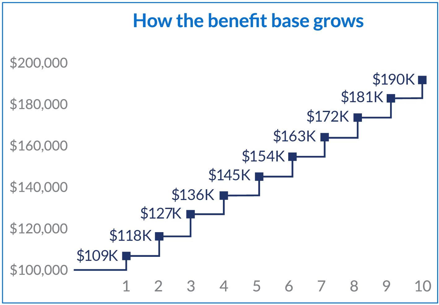 For example, when Carl purchased a FIA with a $100,000 purchase payment, he knew his benefit base would increase by $9,000 per year for 10 years.