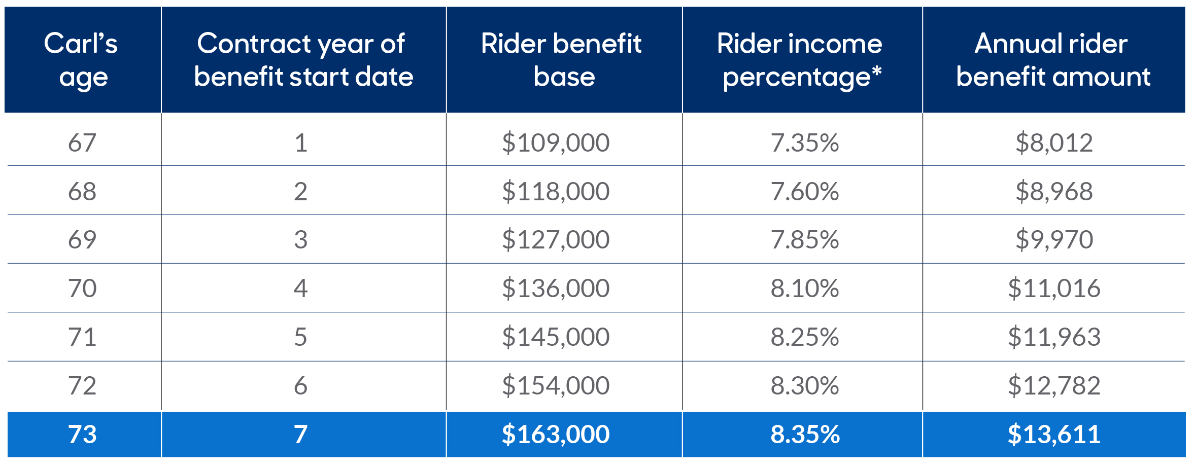 Carl decides he’ll start taking payments when he is 73 – 7 years after he first purchased his FIA with the Income Ascender rider. The benefit base will be multiplied by the rider income percentage, which is based on age at issue (66) and contract year of the benefit start date (7). The total equals Carl’s annual rider benefit amount.